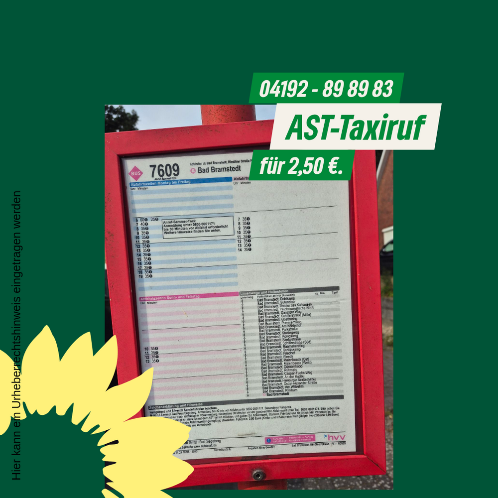 Wusstest Du, dass mit dem Anruf-Sammeltaxi AST alle Bürgerinnen und Bürger zu einem beliebigen Ziel im Stadtgebiet gebracht werden? Oder Anschluss an das ÖPNV-Netz bekommen? Für nur 2,50 € pro Fahrt wirst Du von einer der 46 AST - Haltestellen in Bad Bramstedt mit dem Taxi abgeholt. Wichtig ist, das Taxi mindestens 30 Minuten vor der geplanten Abfahrtzeit anzurufen: 04192 - 89 89 83. Die planmäßigen Abfahrten stehen auf dem Fahrplan an der Haltestelle.