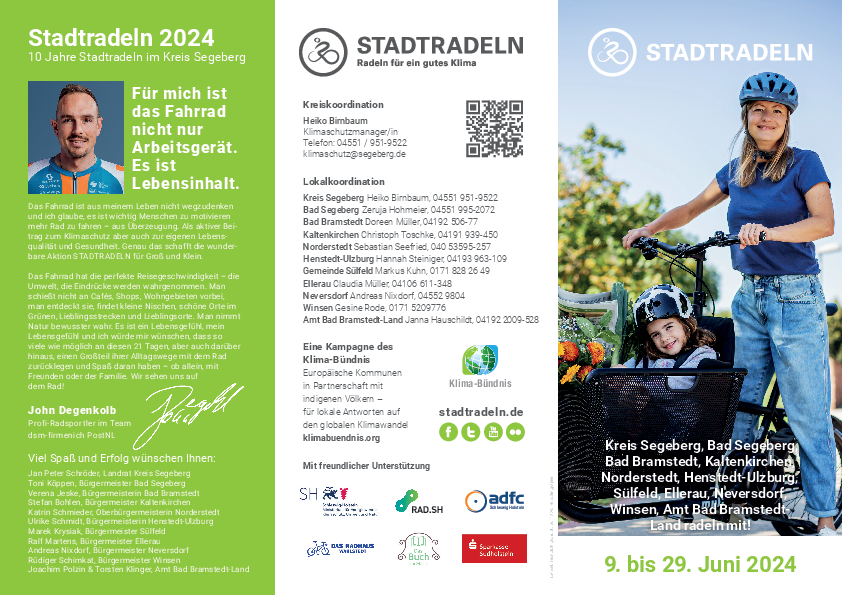 Worum geht’s? Radeln Sie in drei Wochen möglichst viele Kilometer – egal ob beruflich oder privat, Hauptsache CO2-frei unterwegs! Im Anschluss gibt es eine kreisweite Siegerehrung mit Preisverlosung. Zudem prämiert das Klima-Bündnis die fahrradaktivsten Kommunalparlamente und Kommunen. Wie kann ich mitmachen? Registrieren Sie sich unter stadtradeln.de/registrieren und wählen Sie den Kreis Segeberg oder eine der sieben teilnehmenden Kommunen aus. Nun können Sie sich einem bestehenden Team anschließen oder ein neues Team gründen. Wer kann teilnehmen? Alle Bürgerinnen und Bürger aus dem Kreis Segeberg und alle Mitglieder des Kreistags und der Stadt- und Gemeindevertretungen und auch Pendler, die im Kreis arbeiten, können teilnehmen. Wann wird geradelt? vom 9. bis einschließlich 29. Juni 2024 Jetzt registrieren und mitradeln: stadtradeln.de/registrieren