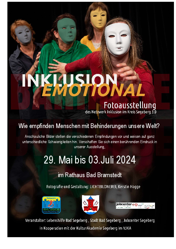 Fotoausstellung des Netzwerk Inklusion. Wie empfinden Menschen mit Behinderungen unsere Welt? Anschauliche Bilder stellen die verschiedenen Empfindungen vor und weisen auf ganz unterschiedliche Schwierigkeiten hin. Verschaffen Sie sich einen berührenden Eindruck in unserer Ausstellung. Fotografie und Gestaltung: Lichtbildnerei, Kerstin Hagge. Veranstalter: Lebenshilfe Bad Segeberg, Stadt Segeberg, Jobcenter Segeberg in Kooperation mit der KulturAkademie Segeberg im VJKA. Besuchen Sie die Fotoausstellung im Rathaus Bad Bramstedt vom 29. Mai bis 3. Juli 2024.