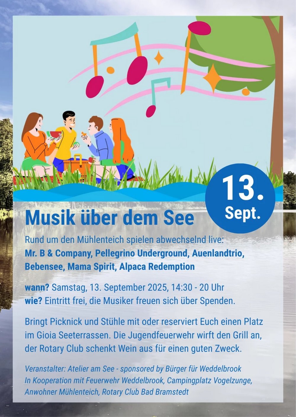 Musik über dem WEDDELBROOKER See am 13. September 2025 von 14:30 - 20:00 Uhr. Eintritt frei! Picknick und Stühle können mitgebracht werden. Regional bekannte Künstler*innen tauchen den Weddelbrooker Mühlenteich in beschwingte, spätsommerliche Stimmung. Veranstalter sind Atelier am See sponsored by Bürger für Weddelbrook, in Kooperation mit Feuerwehr Weddelbrook, Campingplatz Vogelzunge, Anwohner Mühlenteich, Rotary Club Bad Bramstedt. #musiküberdemsee #weddelbrook