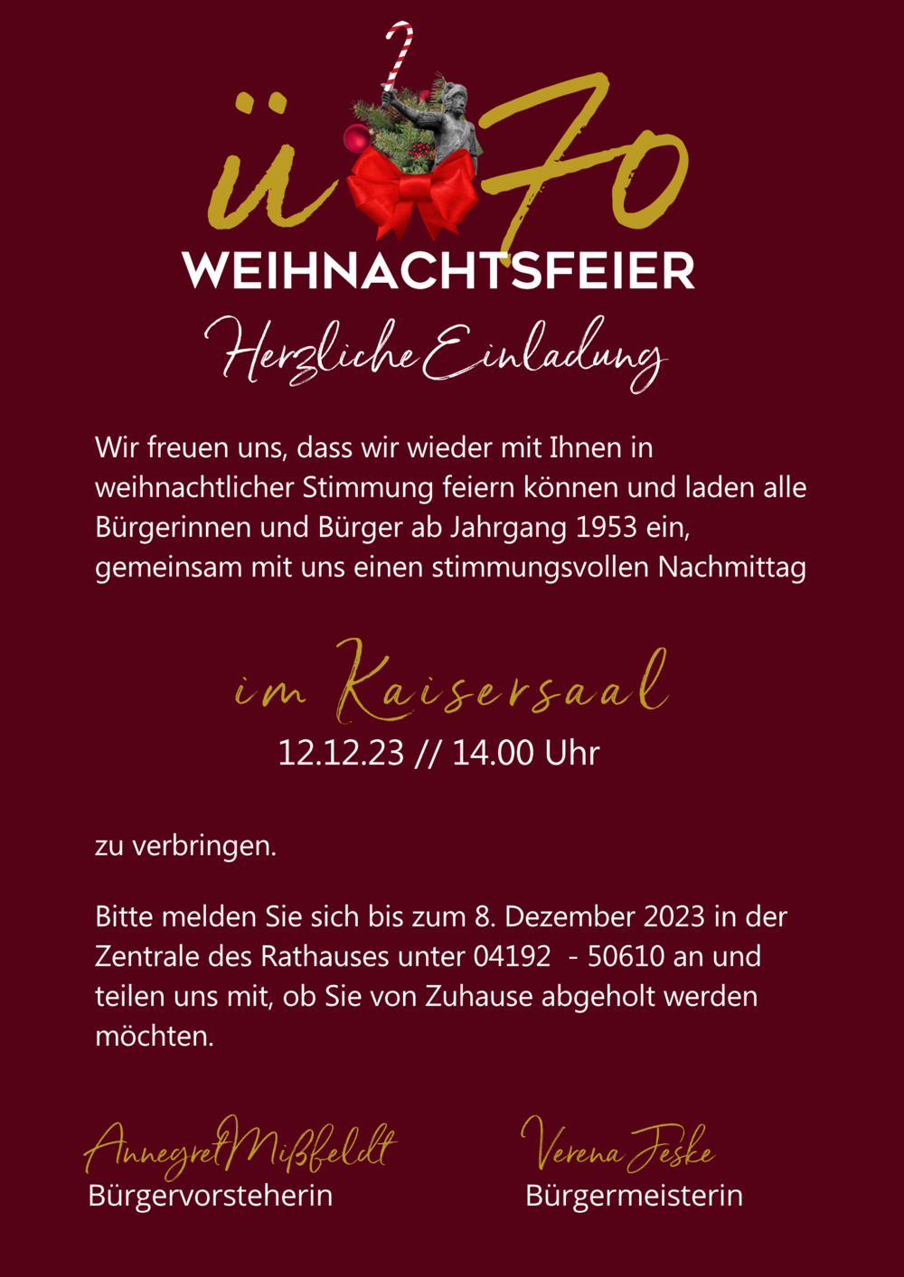 Die Stadt Bad Bramstedt und die Evangelische Kirchengemeinde freuen sich, alle Bürgerinnen und Bürger im Alter von über 70 Jahren herzlich zur diesjährigen Seniorenweihnachtsfeier einzuladen. Dieses festliche Ereignis bietet Gelegenheit, gemeinsam in gemütlicher Atmosphäre die Vorweihnachtszeit zu genießen und die Gesellschaft von Gleichgesinnten zu erleben.