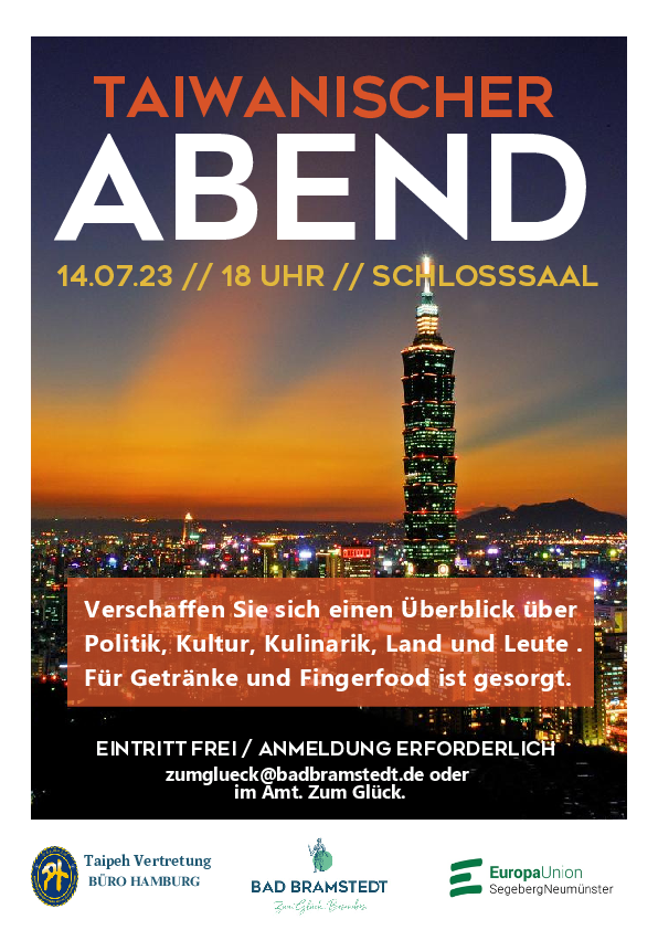 Die Europa Union Segeberg-Neumünster, die Taipeh Vertretung in Hamburg und die Stadt Bad Bramstedt freuen sich, den ersten taiwanischen Abend in Bad Bramstedt ankündigen zu dürfen. Diese spannende Veranstaltung wird am 14. Juli 2023 um 18.30 Uhr im Schlosssaal stattfinden und allen Besuchern die Möglichkeit bieten, die faszinierende Kultur, Geschichte und Traditionen Taiwans zu entdecken.
