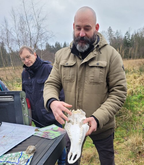 Der Wildbiologe und Jäger Frank Zabel hat uns anhand von Rotwild-Schädeln demonstriert, wie weit die genetische Verarmung bei Rotwild in dieser Region bereits fortgeschritten ist. Es steht schlecht um unseren größten wandernden Landsäuger. Durch das Voranschreiten der Lebensraumzerschneidung stehen viele Wanderkorridore nicht mehr zur Verfügung, sodass es zu wenig genetischen Austausch gibt. Deshalb haben die Wildbrücken so eine große Bedeutung, nicht nur für Rotwild.